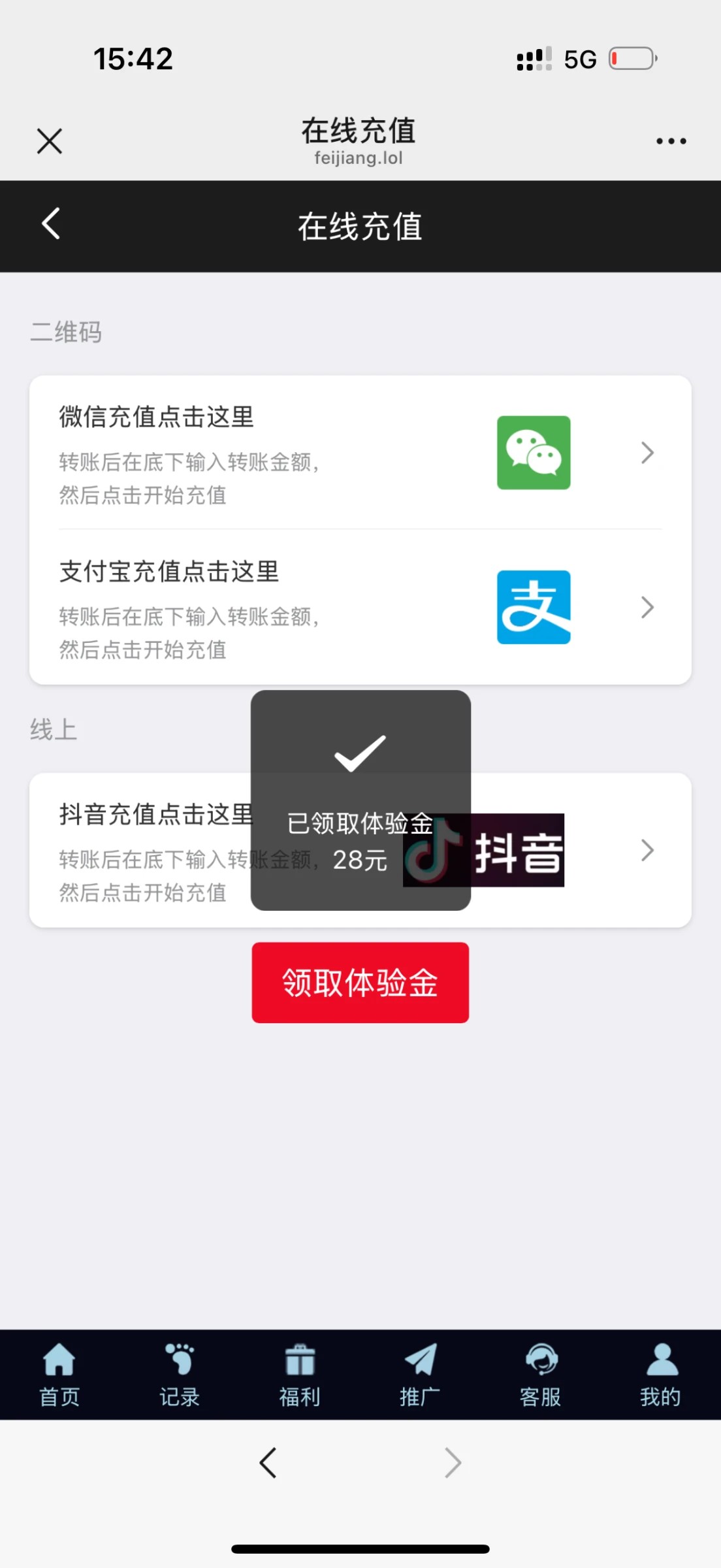 充值里领取体验金秒送28!