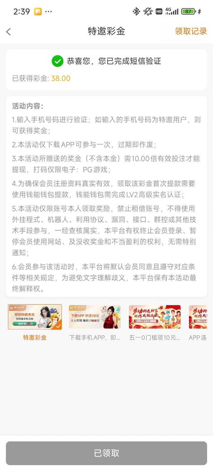 短信验证领38,十倍水,提款上限没写,首次必须钱能出款