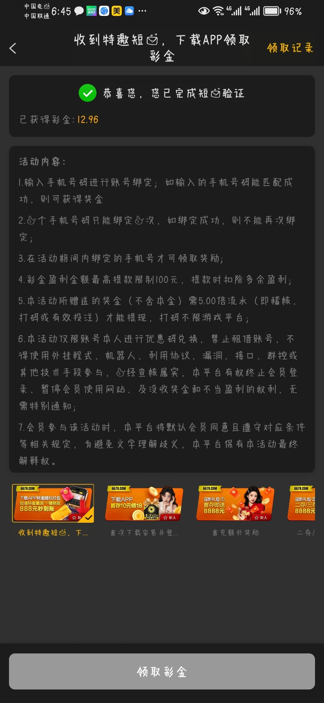 短信特邀碰瓷,下载领特邀彩金