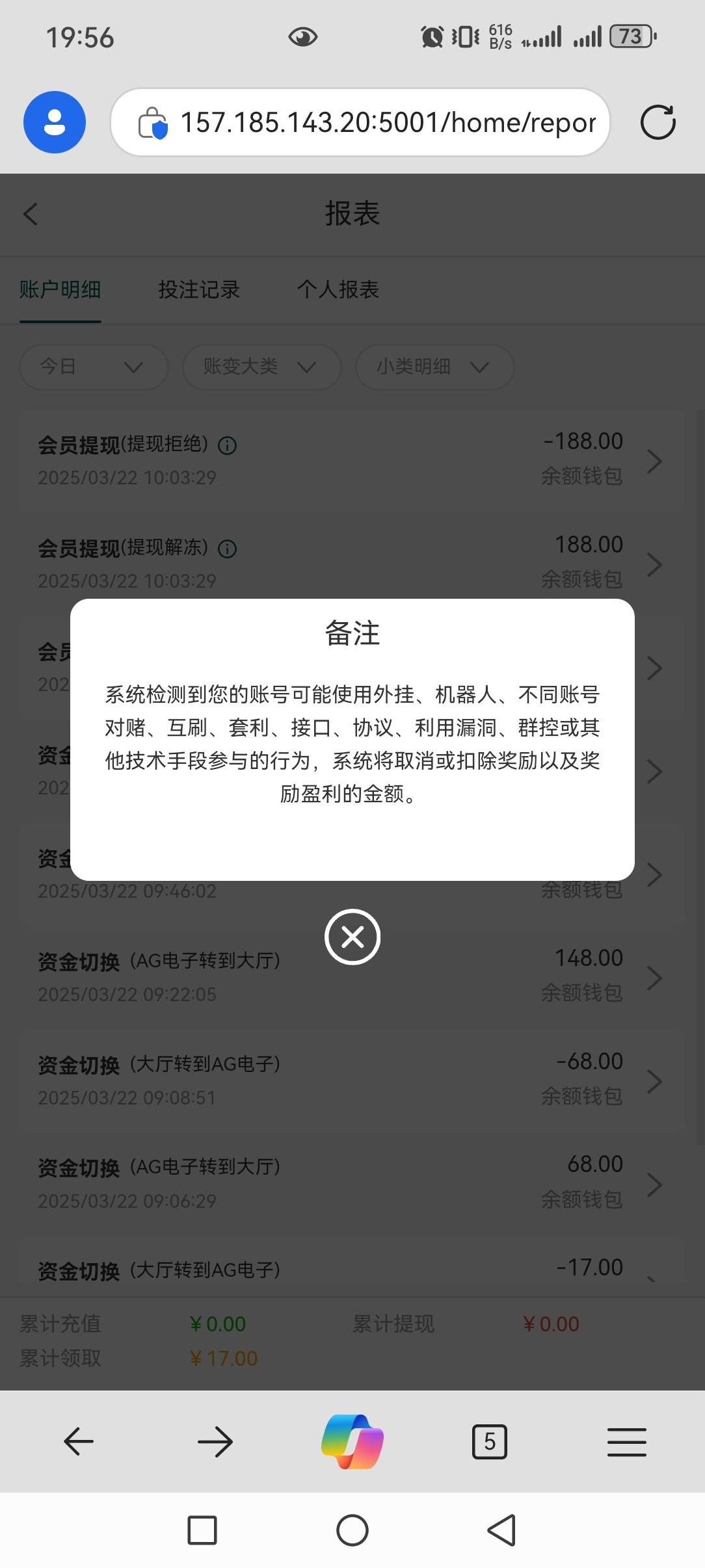尘羽 就是给了17彩金,我打ag电子打到188,提现拒绝,然后把188都扣完了,现在余额0